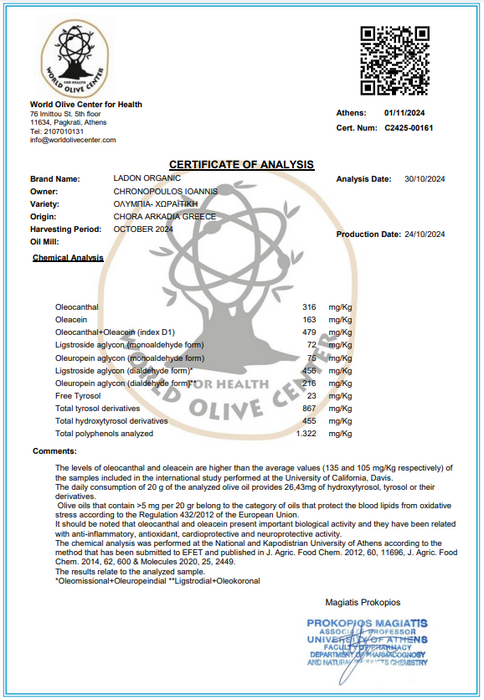 Certificate of Analysis for Polyphenols: Conducted on 30/10/2024 for this 2024/25 harvest of olive oil (certificate included in product images)
